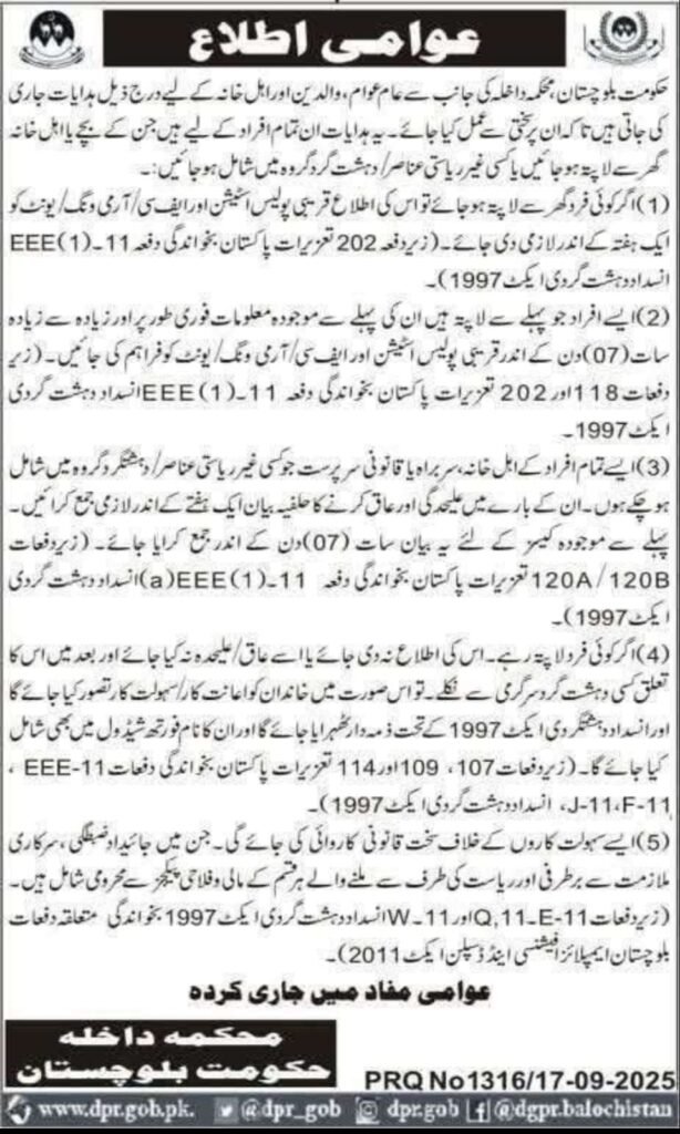 Earlier instructions have issued by the Home Department, Government of Balochistan, for the general public, parents, and families to be strictly followed. These instructions are for all those whose children or family members go missing from home or join any non-state actors/terrorist group.