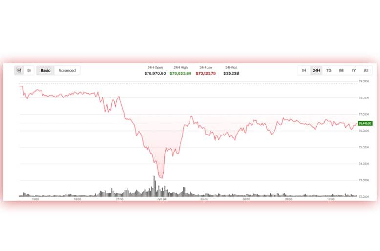 In early Asian trading, Bitcoin dipped to $73,072.44 at around 12:05 am before recovering slightly. The digital asset later touched a daily high of $76,820 near 2:10 am. Despite the bounce, sentiment remained weak. Over the past 24 hours, Bitcoin was down by about 3.57 percent and was hovering close to the $76,000 level.