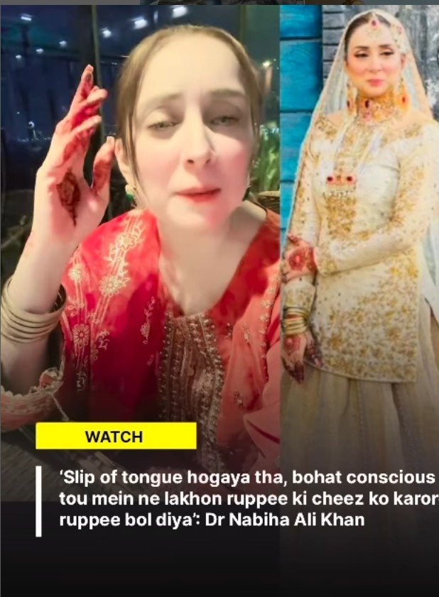 LAHORE: Social media influencer Dr Nabiha Ali Khan, hitting back at her critics, said her wedding dress was not worth millions and that her “tongue slipped out of joy.”