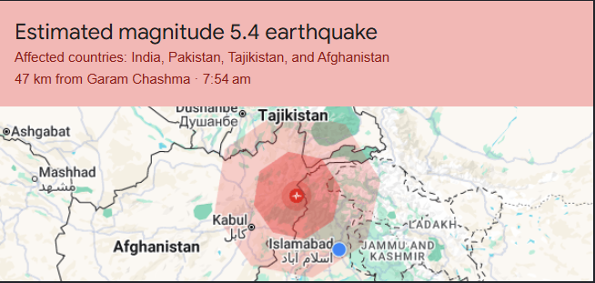On the morning of April 18, earthquake tremors were felt in Islamabad and some other parts of Pakistan. The earthquake was felt from 7:54 am to 7:56 am.