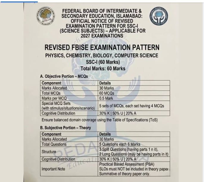 The Federal Board of Intermediate and Secondary Education (FBISE) has officially announced a revised exam pattern for SSC-I Science subjects on Tuesday.