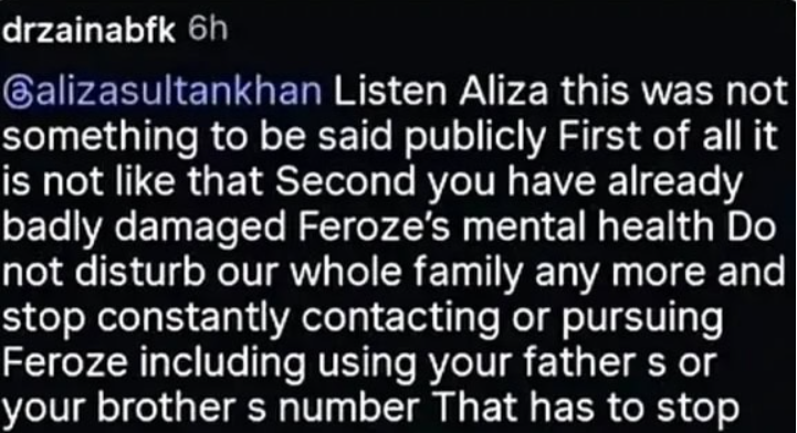 The matter stirred controversy when Dr. Zainab responded directly, accusing Aliza of disturbing Feroze with “hormonal issues” and blaming her for damaging his mental health.