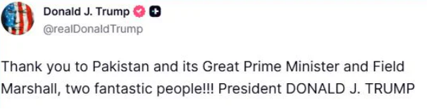 The US President Donald Trump wrote on his Truth Social account, “Thank you to Pakistan and its Great Prime Minister and Field Marshall, two fantastic people.”
