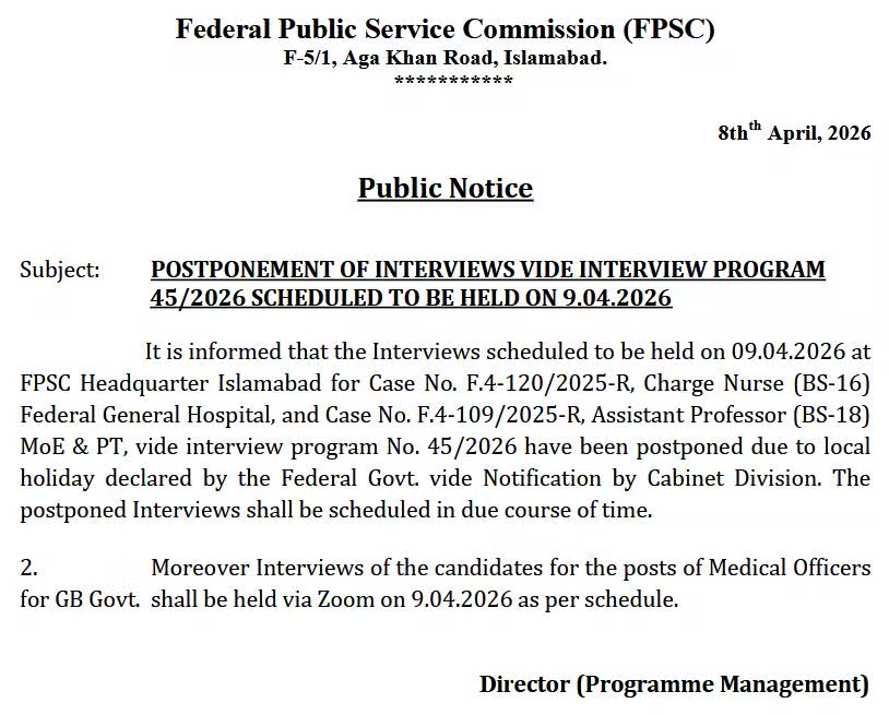 According to an official notification, several interviews planned at FPSC headquarters on April 9, 2026, have been postponed. These include interviews for the posts of Charge Nurse at Federal General Hospital and Assistant Professor at the Ministry of Education and Professional Training.