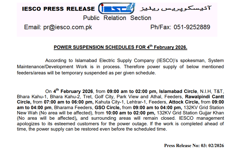 Residents of Islamabad and Rawalpindi Cantt will face a planned power shutdown on Wednesday, February 4, 2026, as Islamabad Electric Supply Company (IESCO) carries out annual maintenance and construction work on parts of its network.