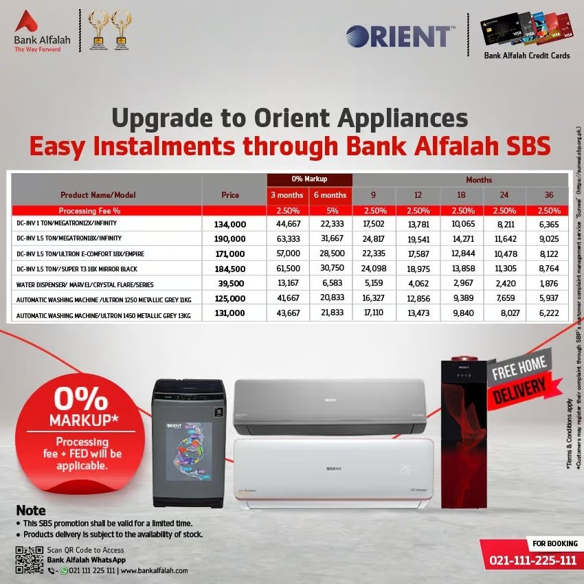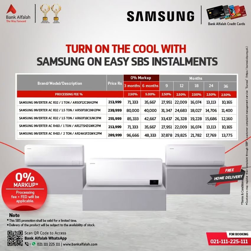 Bank Alfalah has announced installment plans for Inverter AC starting as low as Rs8000 which range from 3 to 36 months.