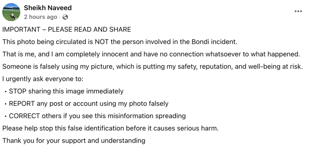 He said, “This photo being circulated is NOT the person involved in the Bondi incident. That is me, and I am completely innocent and have no connection whatsoever to what happened. Someone is falsely using my picture, which is putting my safety, reputation, and well-being at risk.”