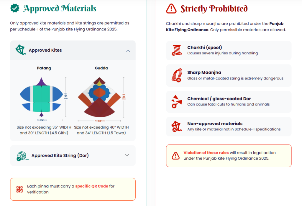 Several materials are clearly marked as strictly prohibited. These include charkhi, or spool-based systems, which can cause serious injuries during handling. Sharp manjha, which is a string coated with glass or metal, is also banned due to its ability to cause deep cuts. Chemical or glass-coated string, sometimes referred to as dangerous dor, is listed as a major hazard to both people and animals.