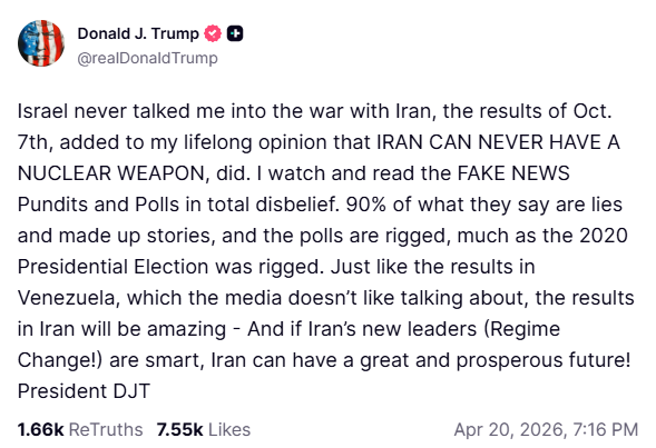 He added that, ‘the results of Oct. 7th, added to my lifelong opinion that IRAN CAN NEVER HAVE A NUCLEAR WEAPON, did.’