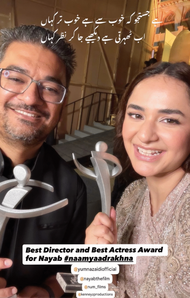 Yumna Zaidi earned her debut film award as Best Actress for Nayab. During her acceptance speech, Yumna spoke about the intense training needed to portray a sportswoman, thanked her mother for her support, and dedicated the award to her.