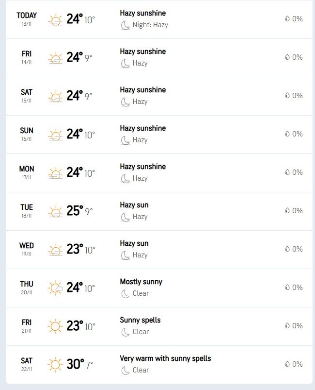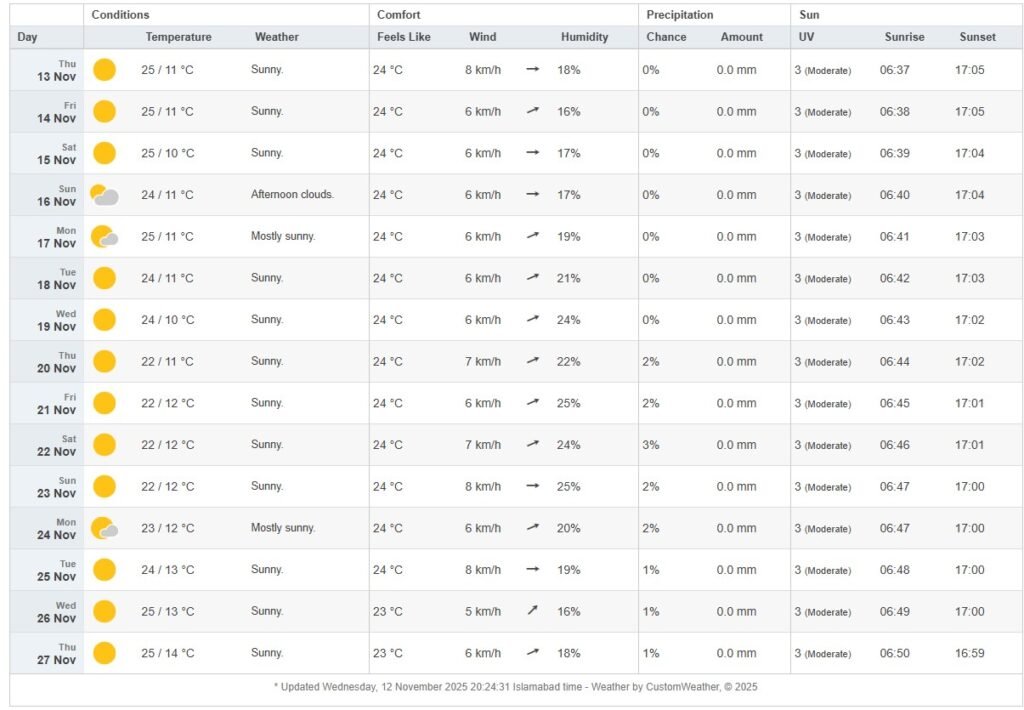 According to independent weather platform timeanddate, Islamabad’s weather is expected to be on the dry side with high temperatures ranging from 25°C on 13th November to 25°C on 27th November.
