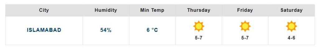 According to Pakistan Meteorological Department, on Thursday, “Dry weather is expected in Islamabad and surroundings, while cold during morning and night.”