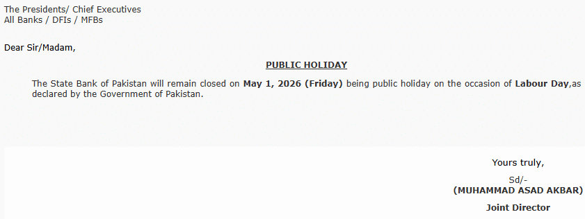 It added that the State Bank of Pakistan will also remain closed on Friday, May 1, 2026, because of Labour Day.
