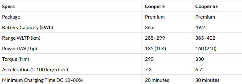 The electric Cooper comes in two models, Cooper E and Cooper SE, offering battery capacities of 36.6 kWh and 49.2 kWh, respectively.