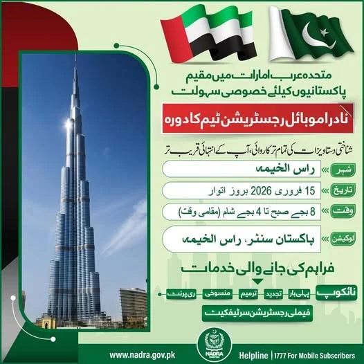 In a social media message, NADRA stated that the NADRA Mobile Registration Team, along with the team of the Pakistan Consulate, will reach Ras Al Khaimah.