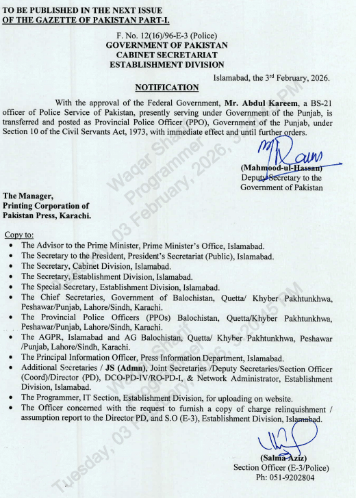 The federal government has also issued the appointment notification of the new Inspector General of Police (IGP) in Punjab. Mr Abdul Kareem, a BS-21 officer, has been appointed as Provincial Police Officer (PPO) in Punjab.