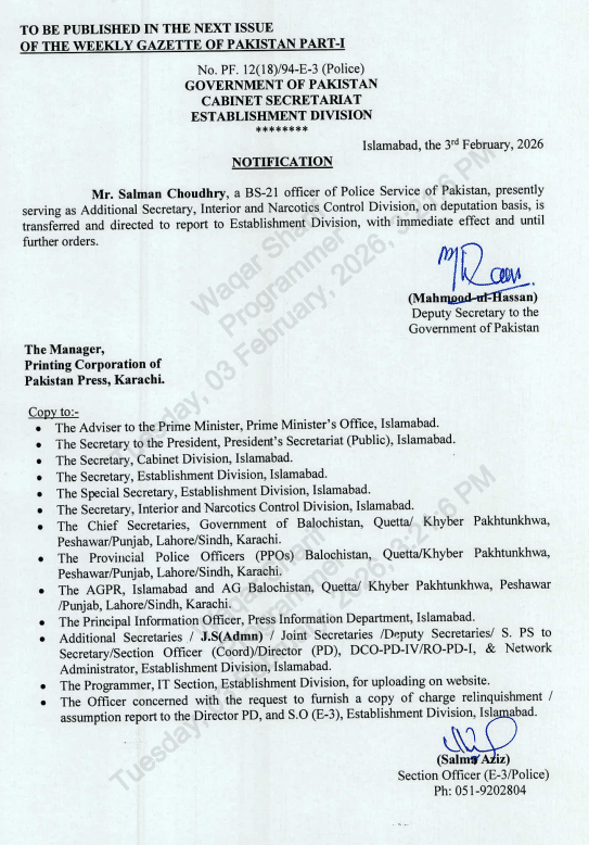 The federal government announced major transfers and appointments on February 3, 2026. As per the notifications issued, Mr Salman Choudhary, who is a BS-21 officer, was directed to immediately report to the Establishment Division. He was serving as Additional Secretary in the Interior and Narcotics Control Division.
