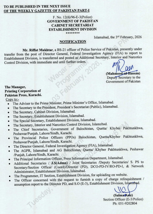 According to a notification issued by the Establishment Division on February 3, 2026, Dr Khan has been transferred from his current position in the Federal Investigation Agency (FIA), where he was serving under the Interior and Narcotics Control Division. He is a BS-20 officer of the Police Service of Pakistan.