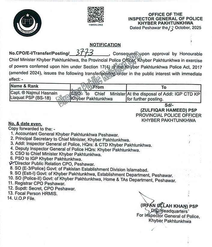 Chief Security officer Najam ul Hassan has become the first casualty of the new CM KP. He has been removed from his post of Chief Security Officer and directed to report to the CTD (Counter Terrorism Department).