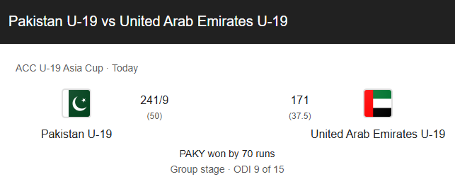 In a group match, Pakistan Under-19 defeated UAE Under-19 to secure a place in the semi-finals, as shown in the Pakistan National Under-19 Cricket Team vs United Arab Emirates National Under-19 Cricket Team match scorecard.