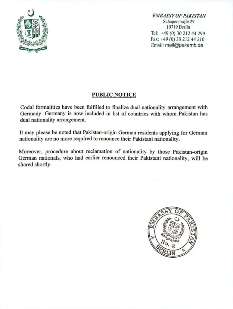 In a public notice, the Pakistan Embassy in Germany has confirmed that it has been added to the list of countries with which Pakistan allows dual nationality.