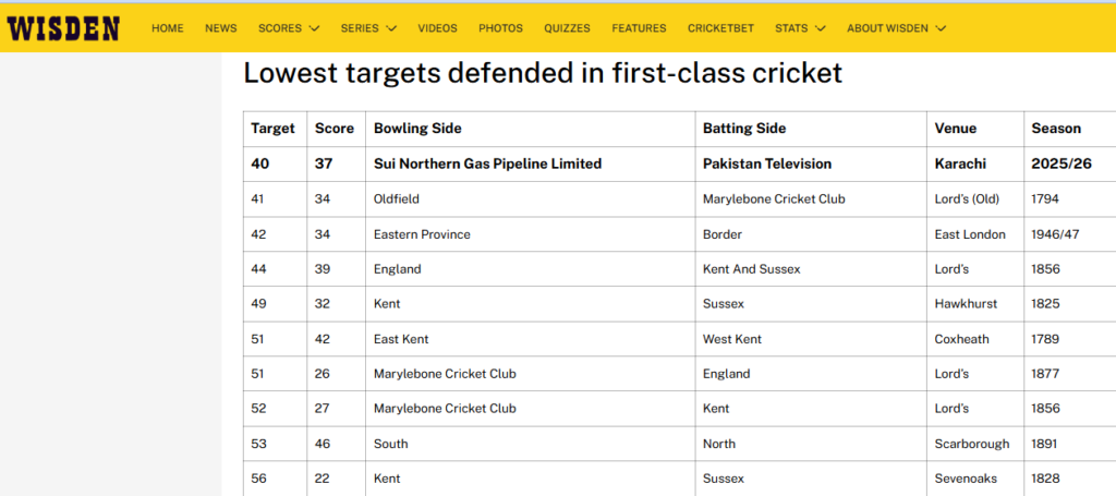 Pakistan Television (PTV) has made history in Karachi by defending the smallest target ever recorded in first-class cricket, breaking a 232-year-old record.