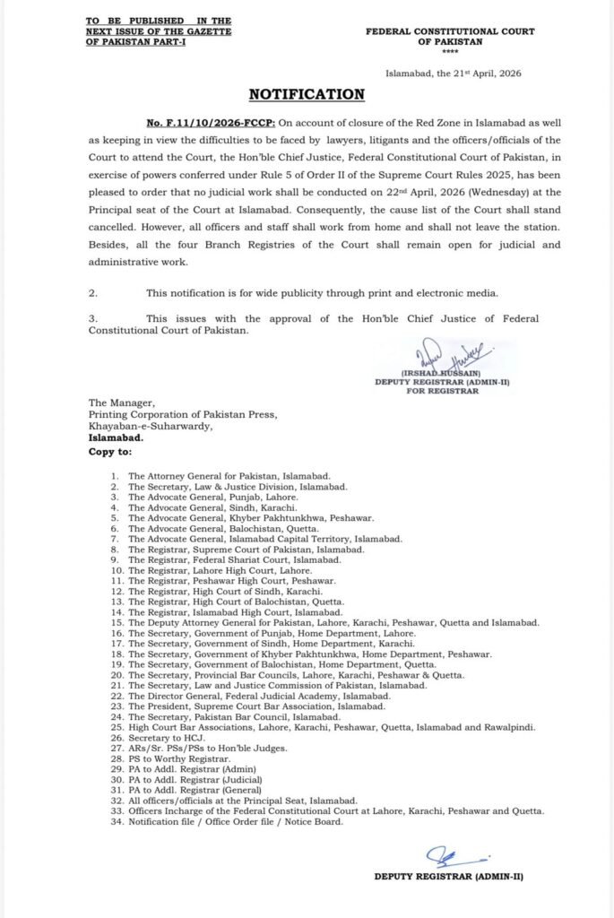 According to the notification, only certain staff of the Supreme Court will perform duties in the court tomorrow.