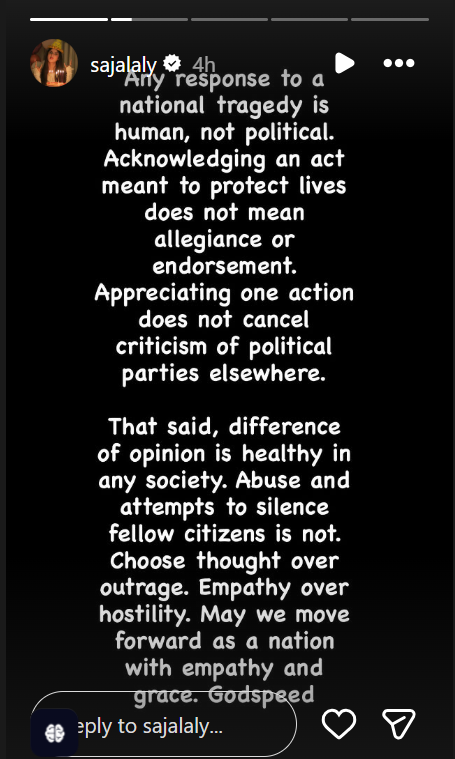 In her Instagram story, she said, “Any response to a national tragedy is human, not political. Acknowledging an act meant to protect lives does not mean allegiance or endorsement. Appreciating one action does not cancel criticism of political parties elsewhere. That said, differences of opinion are healthy in any society. Abuse and attempts to silence fellow citizens are not. Choose thought over outrage. Empathy over hostility. May we move forward as a nation with empathy and grace. Godspeed.”