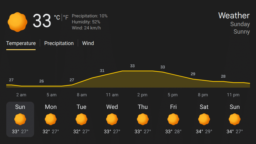 On Saturday, the weather remained warm. The maximum temperatures reached between 33°C and 35°C, and a minimum of around 26°C.