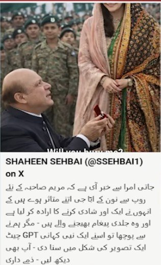 The image, posted on Sehbai’s verified X account and later deleted, showed a fabricated proposal scene with Nawaz Sharif and a woman sparking a debate.