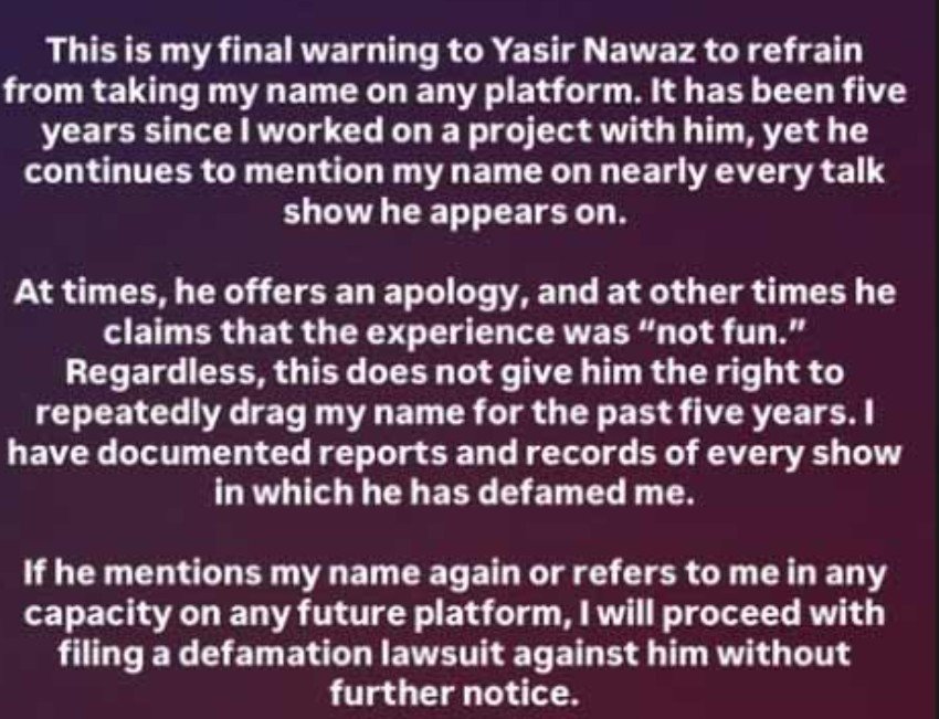 Alizeh Shah wrote in her story, “This is my final warning to Yasir Nawaz to refrain from taking my name on any platform. It has been five years since I worked on a project with him, yet he continues to mention my name on nearly every talk show he appears on.”