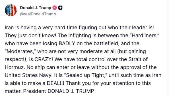 The President wrote in a post on Truth Social, “Iran is having a very hard time figuring out who their leader is! They just don’t know! The infighting is between the “Hardliners,” who have been losing BADLY on the battlefield, and the “Moderates,” who are not very moderate at all (but gaining respect!), is CRAZY! We have total control over the Strait of Hormuz.