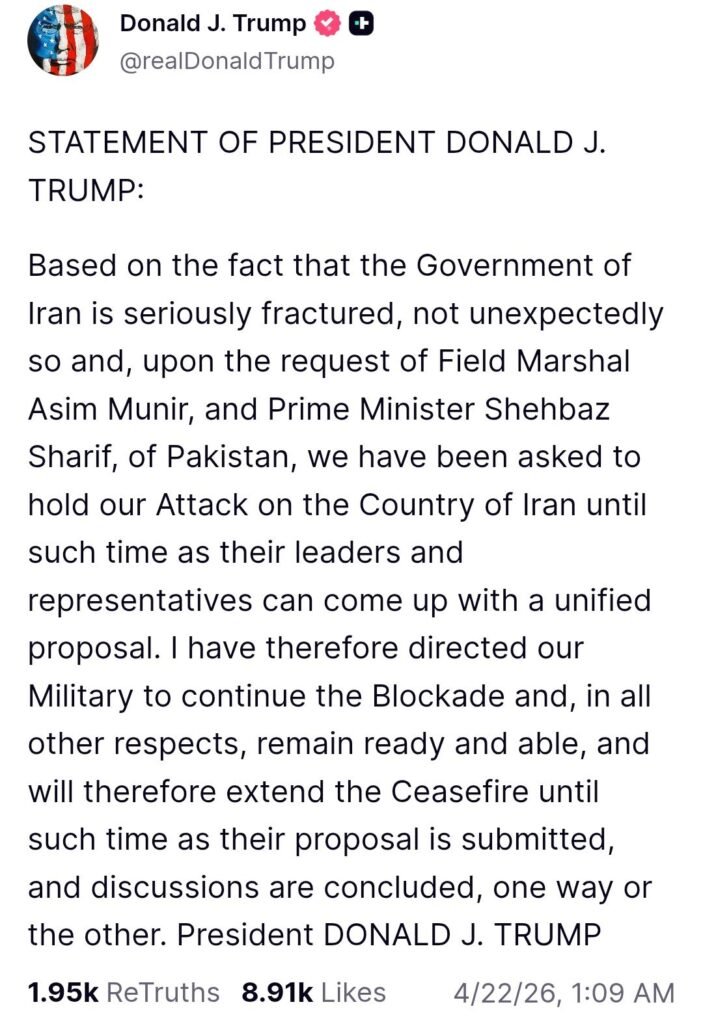 But finally, on Wednesday, Trump announced an extension of the ceasefire with Iran at the request of Pakistan.