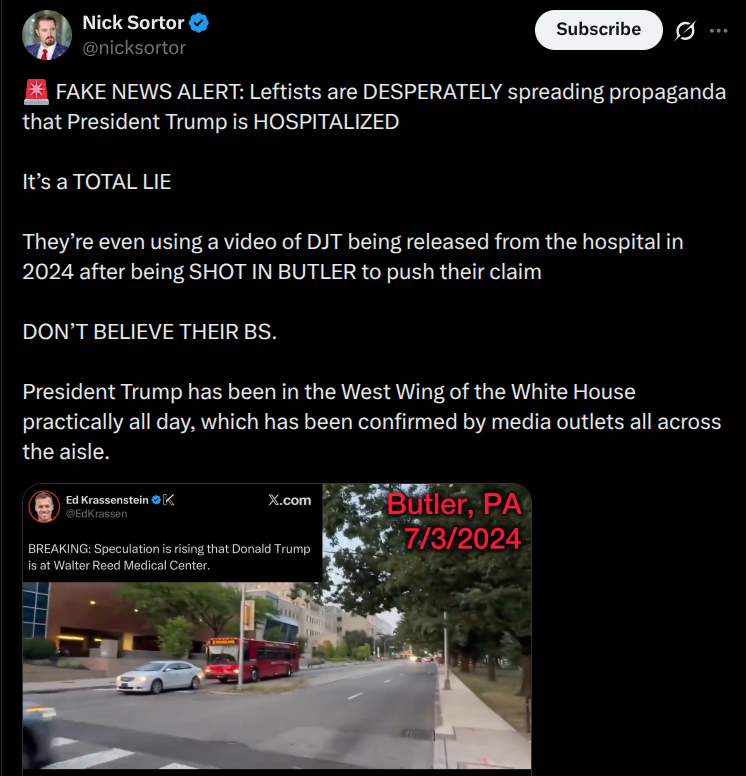 However, some reports also suggest that the video being circulated is of DJT being released from the hospital in 2024 after being ‘SHOT IN BUTLER.’