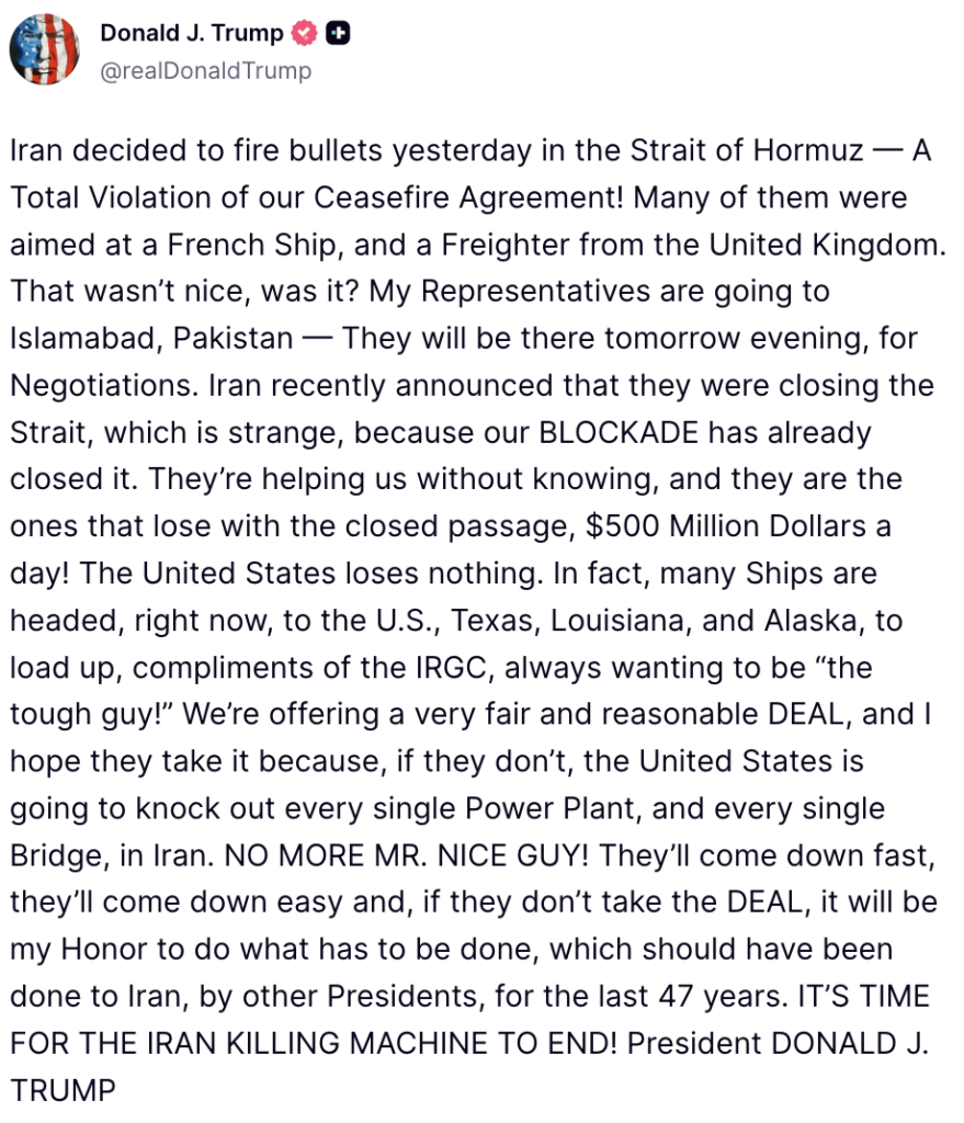 In a post on Truth Social, he said, “My Representatives are going to Islamabad, Pakistan — They will be there tomorrow evening, for Negotiations.”