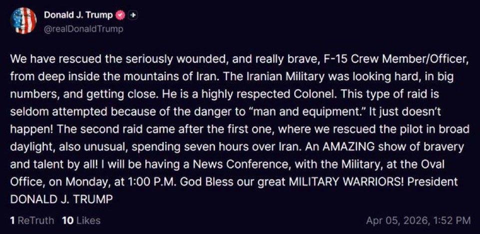 Trump wrote in a post, “We have rescued the seriously wounded, and really brave, F-15 Crew Member/Officer, from deep inside the mountains of Iran. The Iranian Military was looking hard, in big numbers, and getting close.