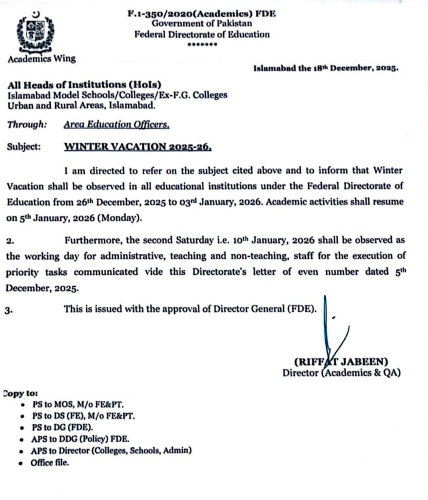 ISLAMABAD: Winter vacations for all schools being run under the ambit of Federal Directorate of Education will begin from December 26, 2025.